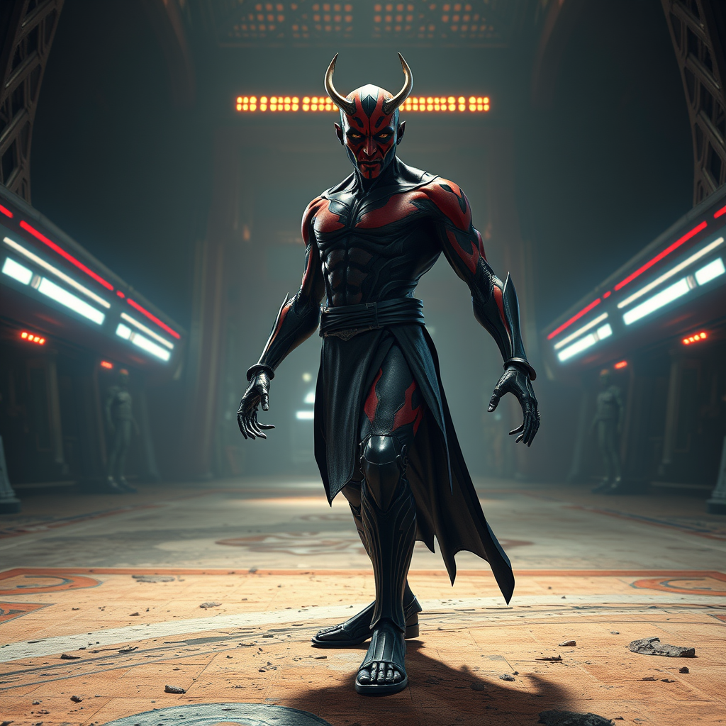 full body view ultra-wide angle frieza final form android ultra-realistic highly detailed cinematic lighting darth maul inspired elements creative adjustments dynamic pose intricate textures vivid colors sci-fi environment intense expression dramatic atmosphere