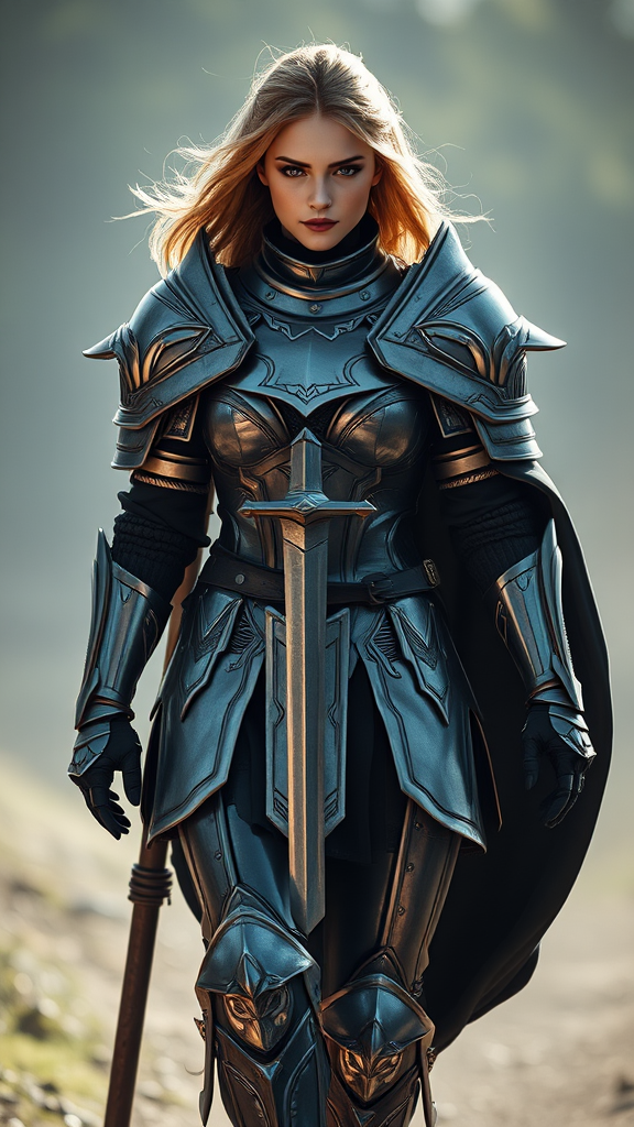 full body, walking pose, front shot, slow motion, female paladin in full armor, detailed face and eyes, Masterpiece, high quality, sharp, realistic, real shadow, 3D, photographed with Canon EOS R6, 135mm, 1/1250s, f/2.8, ISO 400, NG_DeepNegative_V1_75T, avoid lowres, avoid worst quality, avoid blurry, avoid fake, avoid anime, perfect anatomy, elegant, no text, no watermark