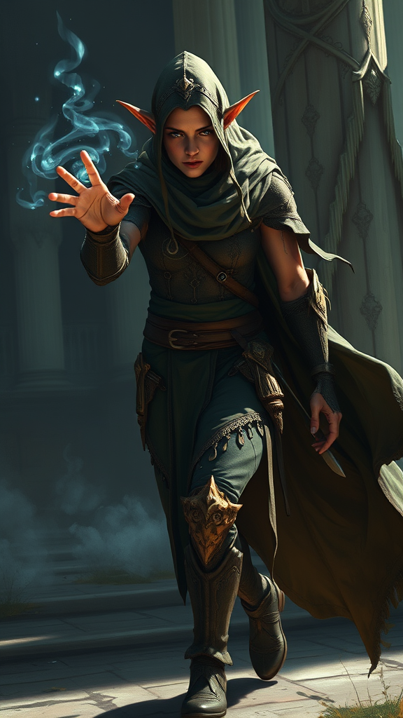 Full body walking pose in slow motion, an anatomical photorealistic digital painting portrait of a high elf casting a spell, featuring detailed face and eyes with Masterpiece quality. Inspired by artists Jeremy Mann, Sandra Chevrier, and Maciej Kuciara, the scene captures sharp realism with real shadows. The artwork presents a photorealistic quality in 8k resolution, avoiding low-quality artifacts and render issues. It emphasizes anatomical accuracy and avoids deformities, extra limbs, or any missing features, ensuring symmetric and well-proportioned anatomy. The visage and eyes are clear and expressive, void of any blur or haze, maintaining a colorful palette rather than monochrome. The composition is precise with no cropping issues or additional items like watermarks, text, or logos, resulting in a pristine, immersive visual experience.
