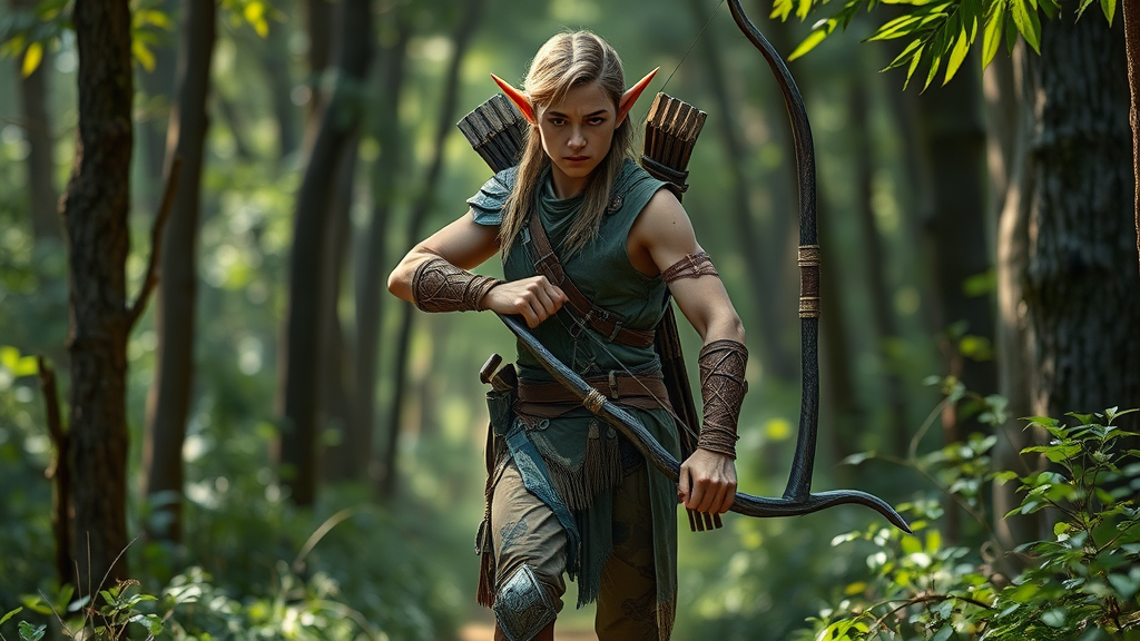 Full body walking pose male elf inspired by Tanis from Dragonlance as an archer in a forest setting, showcasing nature all around him; features a detailed face and expressive eyes, portraying a masterpiece of best quality in 8k photorealistic style, inspired by the artistic styles of Jeremy Mann, Sandra Chevrier, and Maciej Kuciara; incorporates sharp realistic details with real shadows and a 3D effect; subtle creative modifications enhance the natural and mystical essence while maintaining the core concept intact.