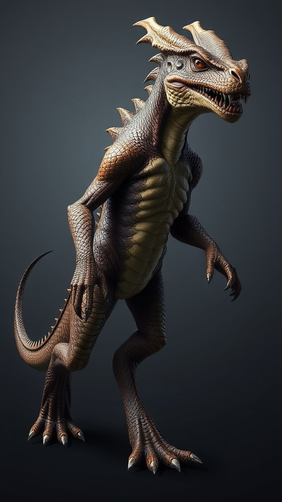 Full body walking pose of a draconian: a fearsome and cunning reptilian humanoid with dragon and humanoid lineage. Standing around seven feet tall, its muscular, scaly body resembles that of a dragon. It features a detailed face with striking eyes, rendered in masterpiece quality at 8k resolution. The image is photorealistic, capturing realistic lighting and shadow with a three-dimensional feel. Influenced by the styles of Jeremy Mann, Sandra Chevrier, and Maciej Kuciara, the depiction is sharp and highly realistic.