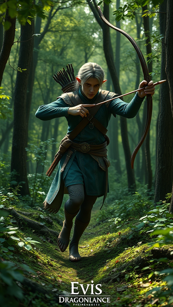 Full body walking pose of a male elf inspired by Tanis from Dragonlance, depicted as an archer moving gracefully through a dense forest. His eyes are detailed and expressive, conveying a deep connection with nature around him. The scene is a masterpiece of best quality, rendered in 8k with photorealistic precision. The image features the artistic influences of Jeremy Mann, Sandra Chevrier, and Maciej Kuciara, with sharp details and realistic shadows in a 3D model. The elf's attire blends naturally with the surrounding forest, showcasing intricate patterns that reflect his sylvan heritage while making slight creative adjustments to highlight his unique character.