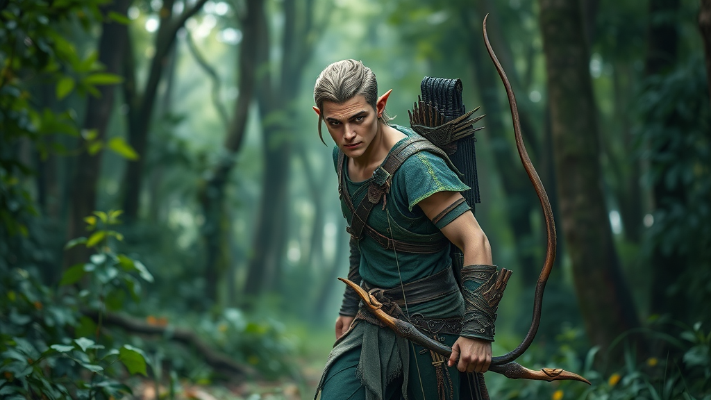 Full body walking pose of a male elf inspired by Tanis from Dragonlance, portrayed as an archer in a lush forest setting. The elf has a detailed face with expressive eyes, depicted in a masterpiece quality, capturing an 8k photorealistic style. Influenced by the works of Jeremy Mann, Sandra Chevrier, and Maciej Kuciara, the rendition features sharp, realistic details and real shadows, giving it a 3D appearance. The elf stands with a sense of grace and agility, his attire blending harmoniously with the natural surroundings, featuring subtle creative variations that enhance the core essence of the scene.
