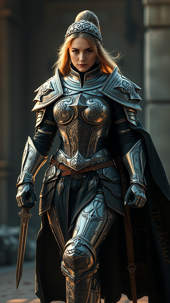 Full body walking pose slow motion female paladin in full armor with intricate engravings detailed face and expressive eyes Masterpiece best quality 8k photorealistic inspired by Jeremy Mann Sandra Chevrier and Maciej Kuciara sharp realistic real shadow enhanced with 3d elements blending cartoon anime and sketch styles subtle creative modifications maintaining core concept intact atmospheric lighting dynamic movement high definition detailed backgrounds.