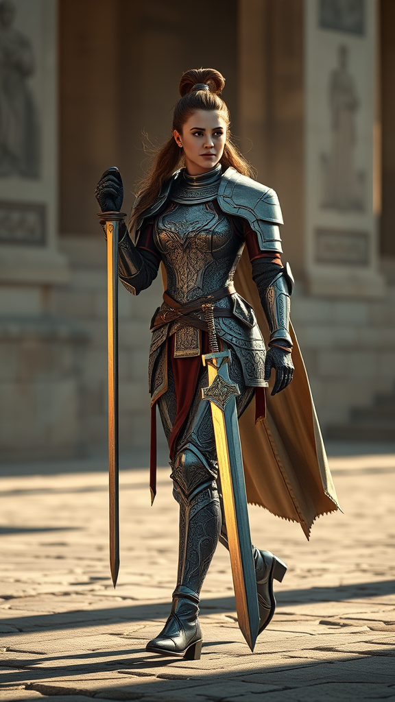 Full body walking pose, slow motion, female paladin wearing intricately designed full armor, holding a magnificent great sword in her right hand, in a stunning masterpiece, high quality 8k photorealistic style, inspired by the works of Jeremy Mann, Sandra Chevrier, and Maciej Kuciara. Sharp and realistic with authentic shadows, in a 3d rendered environment. The image focuses on a lifelike depiction, avoiding jpeg artifacts, blur, and haze. Maintains clarity without monochrome or b&w tones, ensuring eyes are clear and anatomy is accurate. Careful attention is paid to proportions and symmetry, with no extra limbs or misplaced features. Avoids inclusion of any watermarks, logos, text, or signatures, ensuring hands and limbs are correctly drawn and positioned, the scene is free of any distortions or unintended elements.