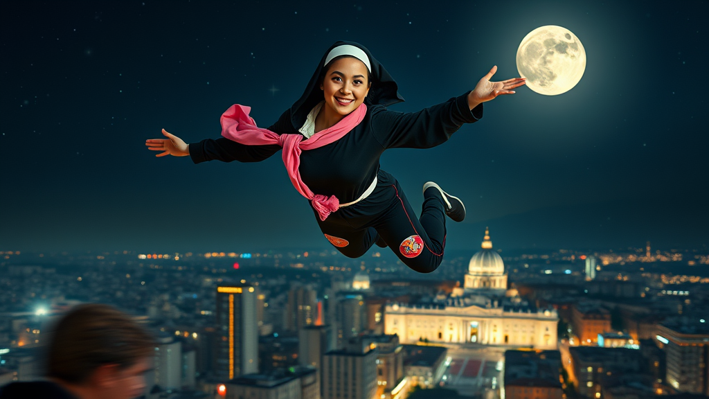 full body, young professional woman dressed as a playful flying nun, suspended mid-air over a vibrant cityscape, benevolent gaze, enigmatic, pink scarf draped over the shoulder, scintillating stars twinkling in the dark night sky, jogging pants with colorful allegorical patches, fleeing figure darting past in the foreground, breaders and high-rise buildings glitting in the partial moonlight, difficulty discriminating between the close-up foreground and haze-blurred background, soft vertically hewn silhouette of St. Peter's Basilica fading into the atmospheric distant view