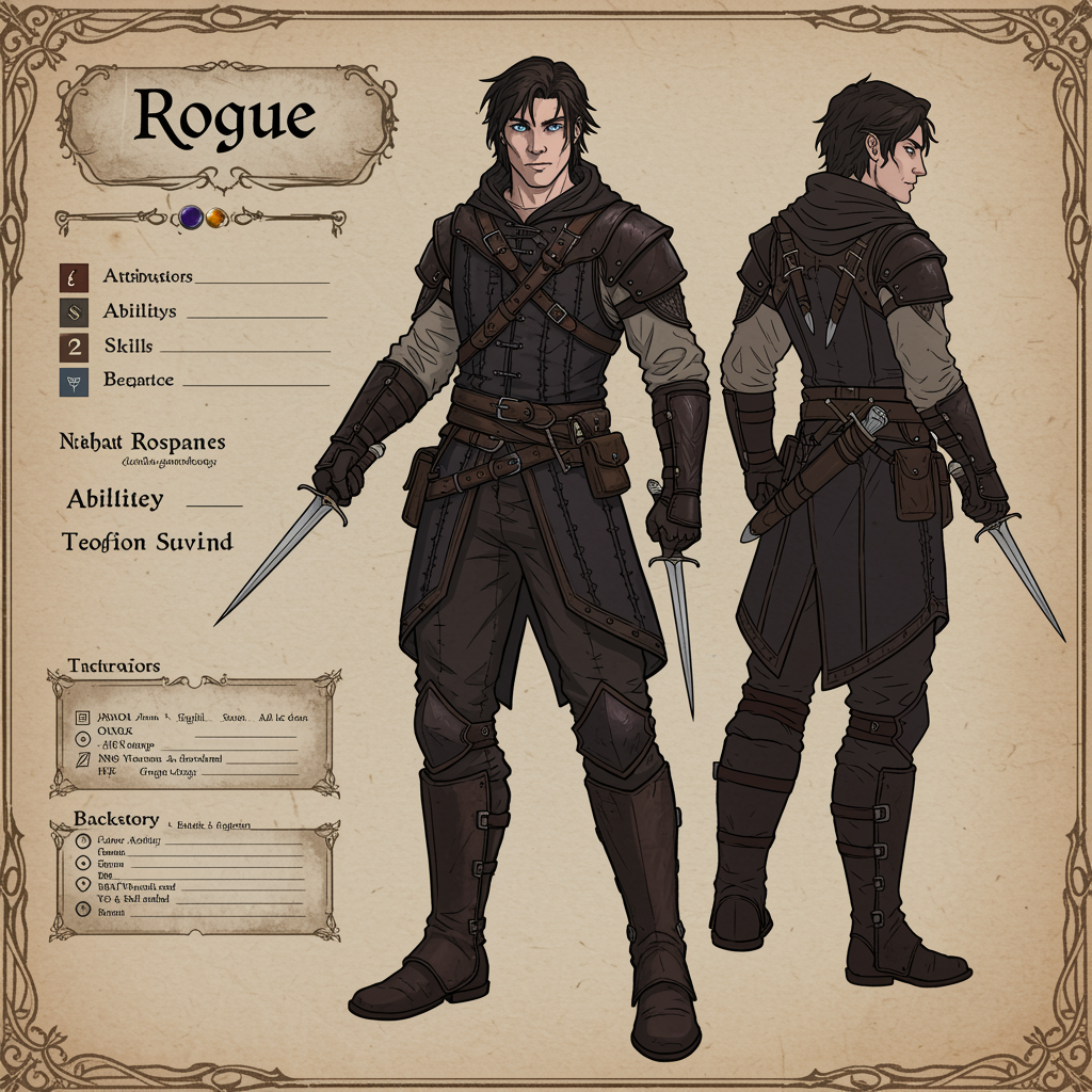 Full character reference sheet in a fantasy RPG style featuring a detailed male rogue with symmetrical facial features, inspired by Dungeons & Dragons.