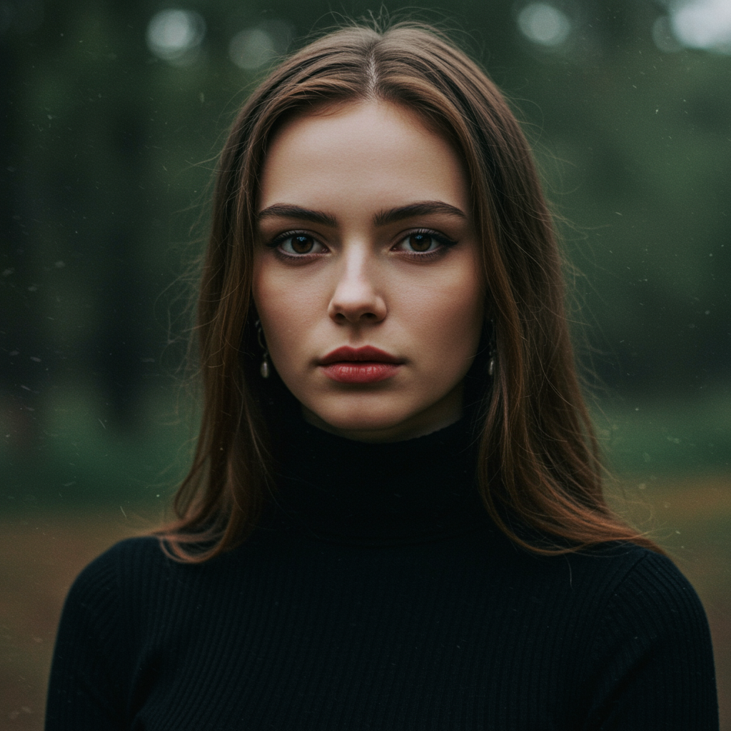 A captivating and detailed full-color portrait of a beautiful woman in a black turtleneck, inspired by the styles of Ilya Kuvshinov, Alessio Albi, and Nina Masic. Her expression is powerful and intriguing, captured in an epic character composition. The scene is in sharp focus with natural lighting, highlighting subtle subsurface scattering. Shot with an f2 aperture and 35mm lens, it features a film grain texture blending cartoon and 3D elements, with hints of unusual colors creating a dreamy atmosphere. The image is ever so slightly blurred for an artistic effect.