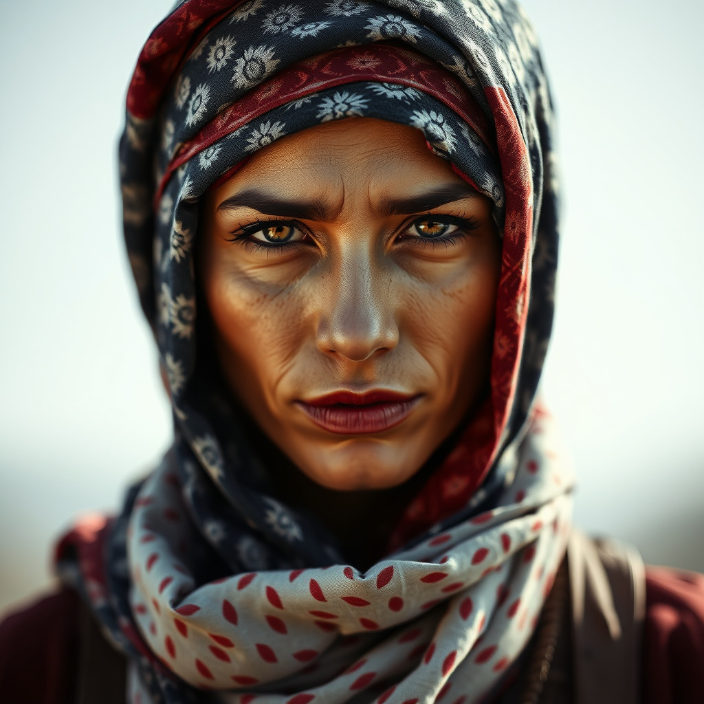 Full color portrait of a Bosnian woman adorned with a traditional keffiyeh, featuring an epic character composition inspired by Ilya Kuvshinov, Terry Richardson, and Annie Leibovitz, showcasing sharp focus and natural lighting. Incorporates subtle subsurface scattering, with an f2 aperture, 35mm lens effect, and a hint of film grain for a cinematic touch. Captures a raw and authentic vibe, with a sense of defiance, rendered in 8k, challenging conventional beauty standards with intentional imperfections and bold expression.