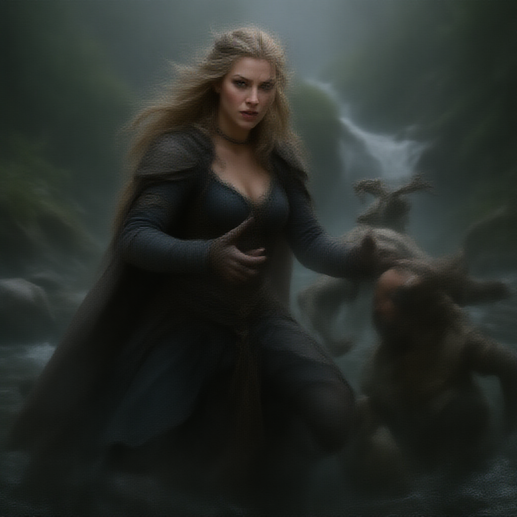 Full female figure in a dynamic pose, healing a companion near a sparkling river, portraying Elira from Dragonlance, an elven druid. She embodies wisdom and is engaged in a tense combat scene. Her face and eyes are highly detailed, capturing deep emotion and intensity, crafted with mastery and the highest quality, 8k resolution, photorealistic. Inspired by the styles of Jeremy Mann, Sandra Chevrier, and Maciej Kuciara, her appearance is sharp and realistic, with authentic shadows; designed in 3D. Negative aspects include avoiding low resolution, more than five fingers, extra arms, facial hair, excess hands, horns, inappropriate attire, nudity, NSFW elements, cartoonish or comic styles, and children.