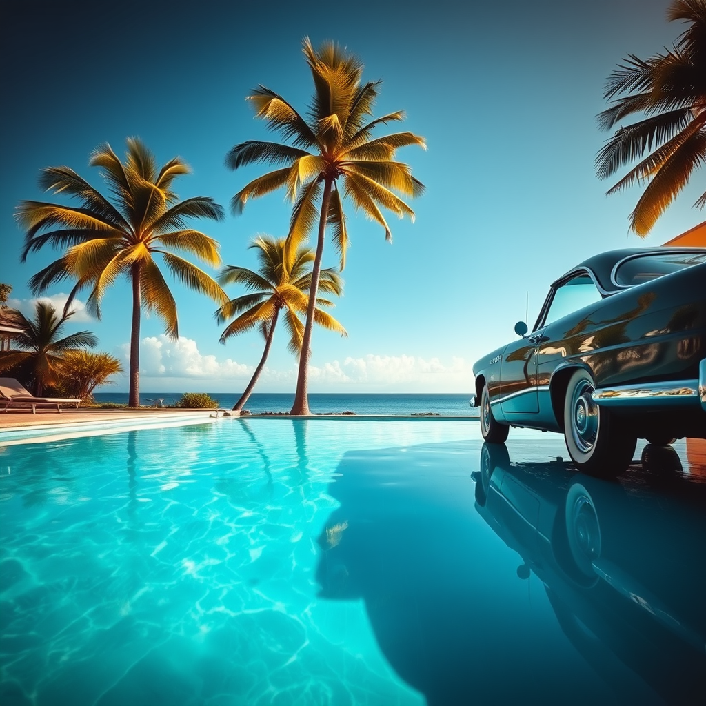 Full frame photograph capturing a sleek vintage car parked beside a glistening azure swimming pool, casting sharp reflections on its polished surface, surrounded by lush palm trees swaying gently in the breeze under a bright, cloudless sky, with retro design elements subtly accentuating the relaxed, sun-drenched vibe of a luxurious summer escape.