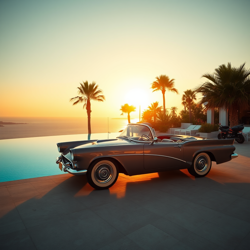Full frame photograph of a sleek, vintage convertible parked by a crystal-clear infinity pool, bathed in the warm glow of a golden sunset with palm trees casting long shadows in a retro-inspired atmosphere, evoking a sense of endless summer luxury and laid-back elegance.