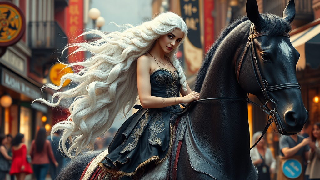 Full height portrait of a stunning Lady Godiva, showcasing her flowing, radiant snow-white braid. She wears an intricate mini dress adorned with delicate patterns, which contrasts beautifully with the massive, sleek black horse she rides. Set against a bustling steampunk street, the scene is rich with intricate details and vibrant elements that capture the imagination. The composition features a full body shot with smooth, sharp focus, echoing the artistry of Ruan Jia, Ilya Kuvshinov, Alphonse Mucha, and Ross Draws, with subtle creative twists to enhance the captivating atmosphere.