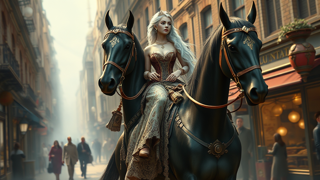 Full height portrait of a stunning Lady Godiva with a cascading snow-white braid, wearing a mini elaborate dress adorned with intricate designs, elegantly riding a towering black horse through a bustling steampunk street. The environment is rich with exquisite details, exuding a polished and vivid focus. The concept art is inspired by the styles of Ruan Jia, Ilya Kuvshinov, Alphonse Mucha, and Ross Draws, blending elements of fantasy with a touch of futuristic charm.