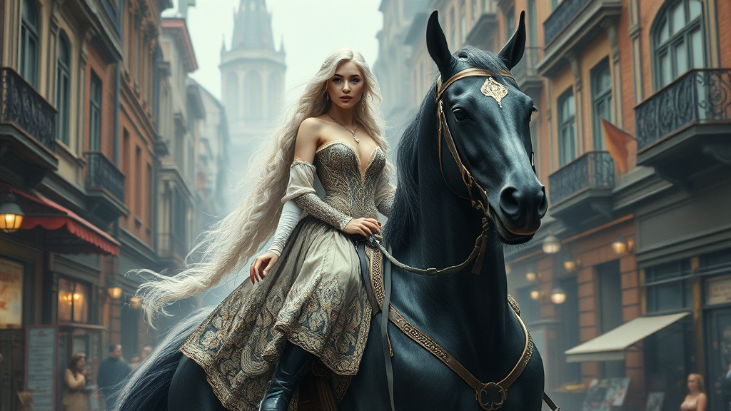 Full height portrait of a stunning Lady Godiva with a flowing snow-white braid, wearing a mini intricately designed dress. She rides a massive black stallion through a bustling steampunk street, filled with intricate details. The scene is highly detailed, capturing a full-body shot with a smooth and sharp focus. Concept art inspired by the styles of Ruan Jia, Ilya Kuvshinov, Alphonse Mucha, and Ross Draws, with slight creative twists added to bring a fresh perspective to the iconic visualization.