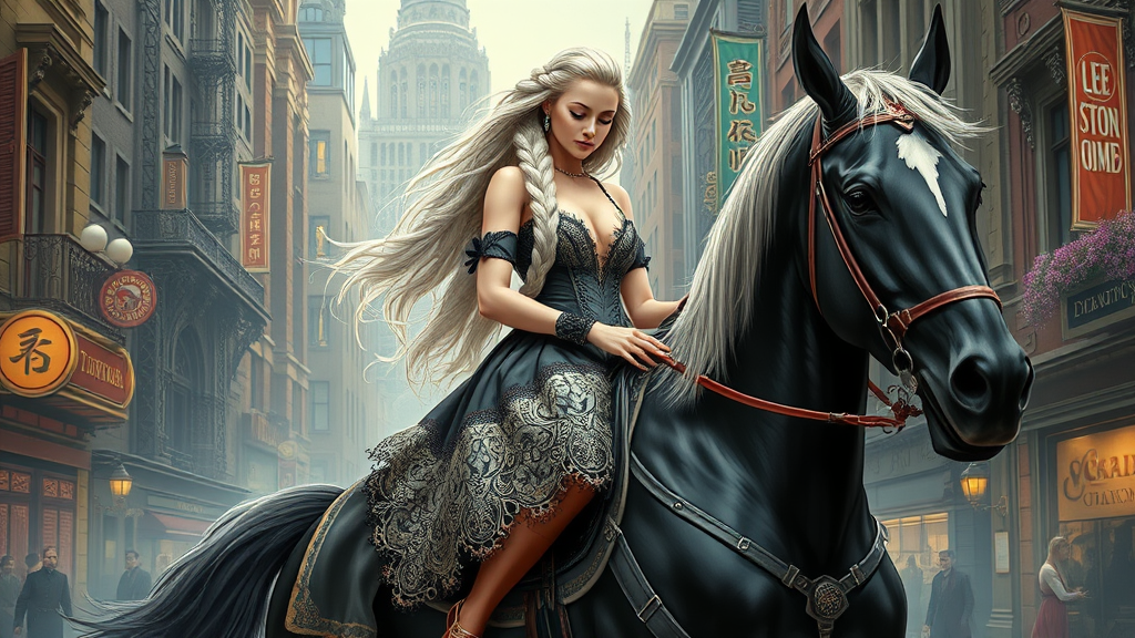 Full height portrait of a stunning Lady Godiva with a flowing, snow-white braid, donned in a detailed, ornate mini dress. She gracefully rides a majestic, large-scale ebony horse through a bustling steampunk cityscape. The scene is rich with intricate details and highly defined elements, captured in a full-body shot with smooth, sharp focus. Concept art inspired by the styles of Ruan Jia, Ilya Kuvshinov, Alphonse Mucha, and Ross Draws, with a touch of fantasy elegance and urban intrigue.