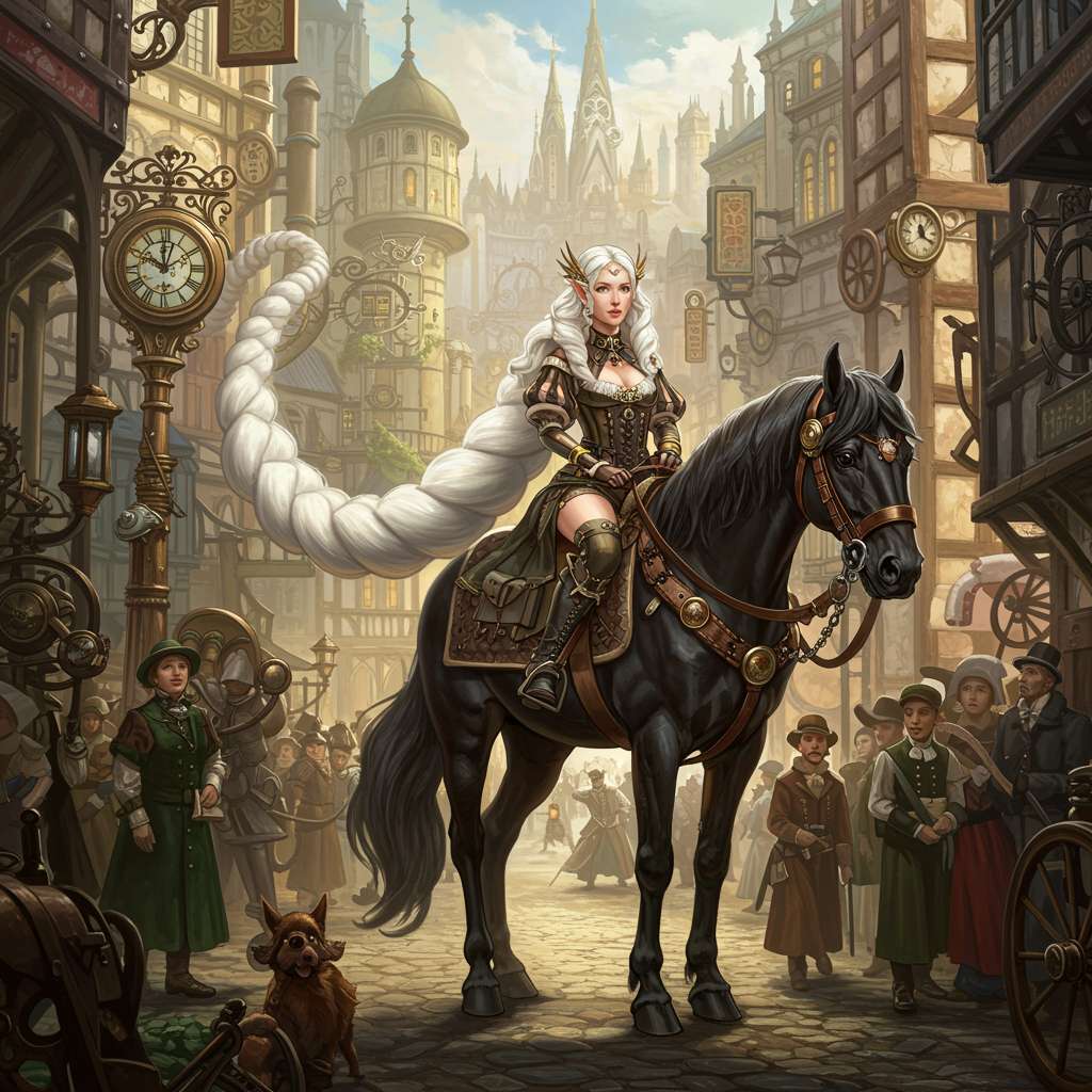 Full height portrait of an enchanting Lady Godiva with an enormous, flowing snow-white braid, adorned in an intricate and stylish mini dress. She rides gracefully atop a majestic black horse along a bustling steampunk street, filled with complex details and vivid imagery. The scene is captured with a smooth, sharp focus, showcasing the intricate craftsmanship and vibrant atmosphere. The concept is inspired by the artistic styles of Ruan Jia, Ilya Kuvshinov, Alphonse Mucha, and Ross Draws. Her expression is serene yet powerful, as steam-powered contraptions and clockwork elements surround them, adding to the fantasy allure.