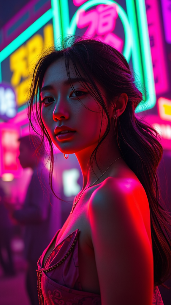 Full-length image of a woman bathed in neon lights against a vivid backdrop, featuring vray tracing style, stylized portraiture, layered lines with an Asian influence, hyper-realistic details, and intense close-ups with contrasting shadows. Embrace neon art nouveau style, merging hyper-realistic sci-fi elements and pop art vibrancy, showcasing silhouette figures with light cyan and light crimson hues. Echo the artistic influence of Paul Corfield, characterized by complex layers and textures, captured using a Fujifilm X-T4 and a Sony FE 85mm f/1.4 GM lens.