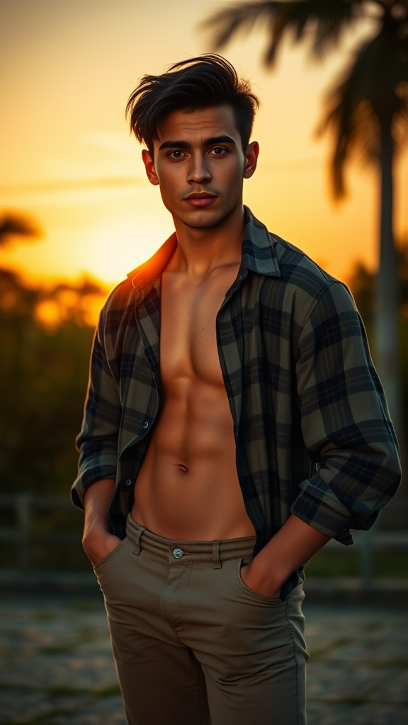 Full-length portrait capturing the complete figure of an attractive Latino man with striking black hair and deep, expressive eyes, standing confidently with an average build and a subtly prominent chest. His unique asymmetrical eyes add character as he poses gracefully, subtly highlighting his legs. The scene is set during the magical golden hour, emphasizing his ultra-realistic skin with a warm, cinematic glow that evokes an award-winning sense of photography. Shot in a wide field of view, the image encapsulates the essence of cinematic artistry in stunning 8kHD resolution, with a touch of creative elegance enhancing the natural beauty of the moment.