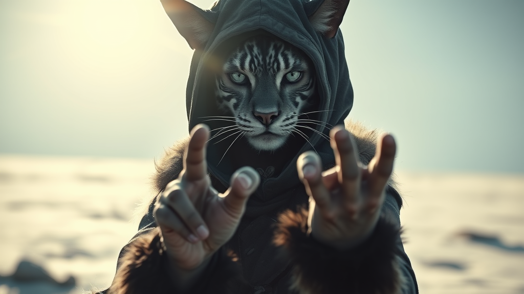 Full-length portrait close-up of a male humanoid figure with feline facial features, wearing obsidian druid robes outdoors. The pose is dynamic and flirtatious, engaging with the camera under dramatic cinematic lighting that intensifies bright highlights. His head is adorned with a hood and cap, and the robes have fur trimmings. The overall look has cold monochrome colors, with intricate and life-like details albeit with some artistic imperfections such as slightly off proportions, fused fingers, and extra ears. The simple background contains subtle noise, contributing to a sense of uninspired simplicity.