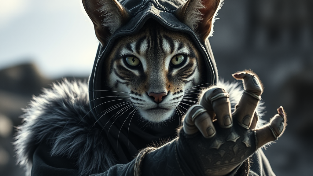 Full-length portrait close-up photograph, highly detailed feline facial features, playfully engaging with the camera, male humanoid body wearing obsidian druid robes with fur trimmings, set outdoors with dramatic cinematic lighting and intense bright highlights, captured in a dynamic pose. The scene is intricately detailed and life-like, with subtly exaggerated and whimsical elements. Monochrome with a hint of cold colors, against a simple background. The character has a hood and cap, amusingly oversized ears, and displays intriguing artistic quirks such as disproportionate features and humorously fused fingers, lending a charmingly imperfect and unique quality to the composition.