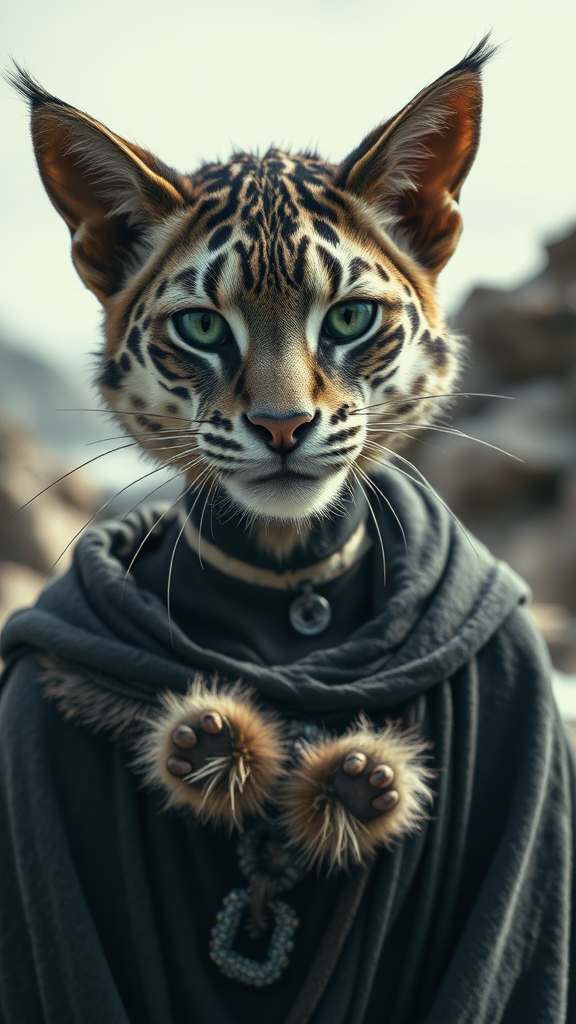 Full-length portrait close-up photograph, highly detailed animal facial features, playfully engaging with the camera, head, male humanoid body, obsidian druid robes, set outdoors with dramatic cinematic lighting, intense bright look, dynamic pose, adorned with fur trimmings, intricately life-like, yet slightly distorted as if drawn by an amateur artist, monochrome palette with uninspired and simple background, subtle background noise, exaggerated proportions, fused fingers, hooded cape, additional sets of ears, cool color scheme, feline characteristics.