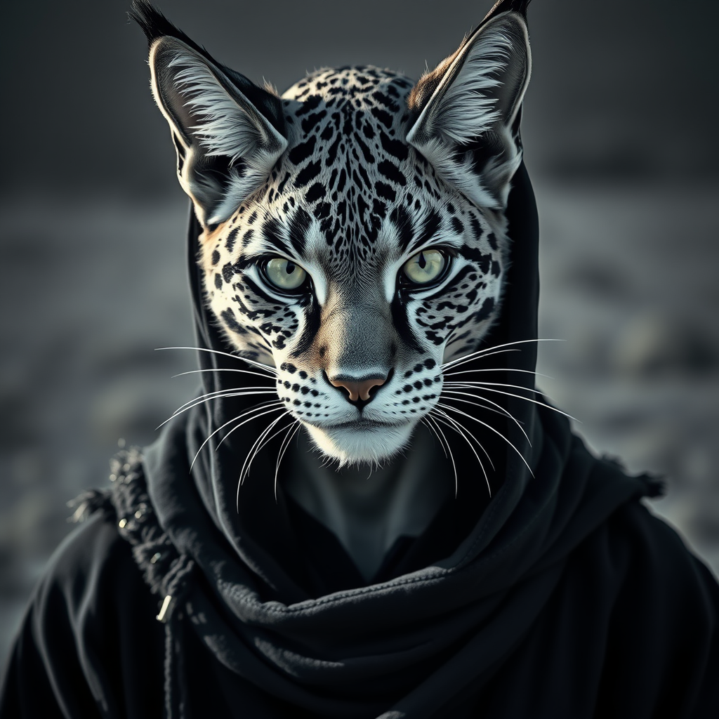 Full-length portrait, close-up photograph, highly detailed feline facial features, engaging with the camera, head, male humanoid figure, obsidian druid robes, natural outdoor setting, dramatic cinematic lighting, intense brightness, dynamic posture, fur accents, intricate, hyper-realistic yet awkwardly sketched, unrefined artist style, monochrome, plain background, subtle background noise, odd proportions, fused fingers, hooded, additional ears, cool color palette, feline essence.