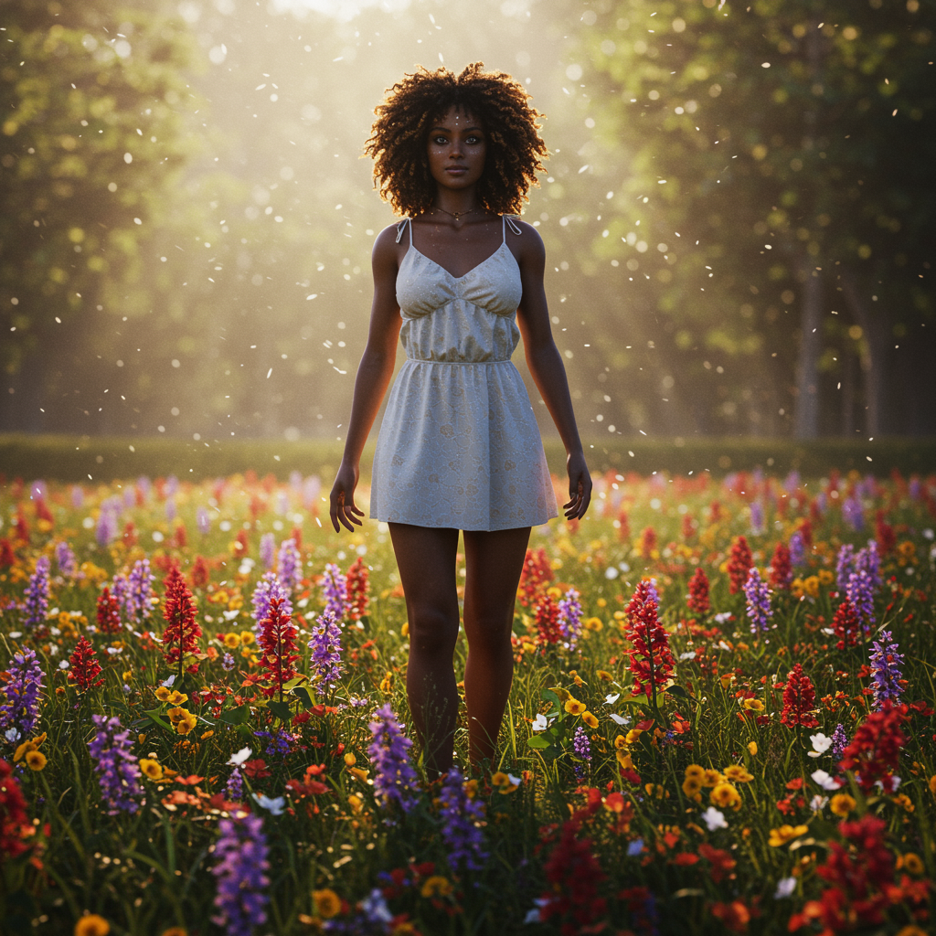 View this AI-generated image featuring a hyperrealistic full length portrait of a stunning goddess standing in a vibrant field of flowers she has an exquisitely detailed captivating face and is dressed in an elegant white sundress the scene is illuminated by god rays creating an intricate and cinema