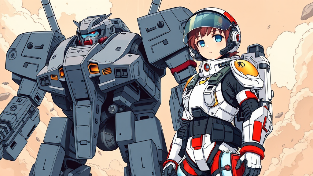 Full length portrait of a battle-ready armored astronaut girl in a striking comic book style, accompanied by an imposing battlemech. The artwork is highly detailed, displaying exquisite fanart qualities with vibrant colors similar to a full color manga. The design captures the dynamic essence of a key visual from an anime, drawing on the imaginative world-building seen in Valerian and Nartfixer, while maintaining a unique, imaginative flair.