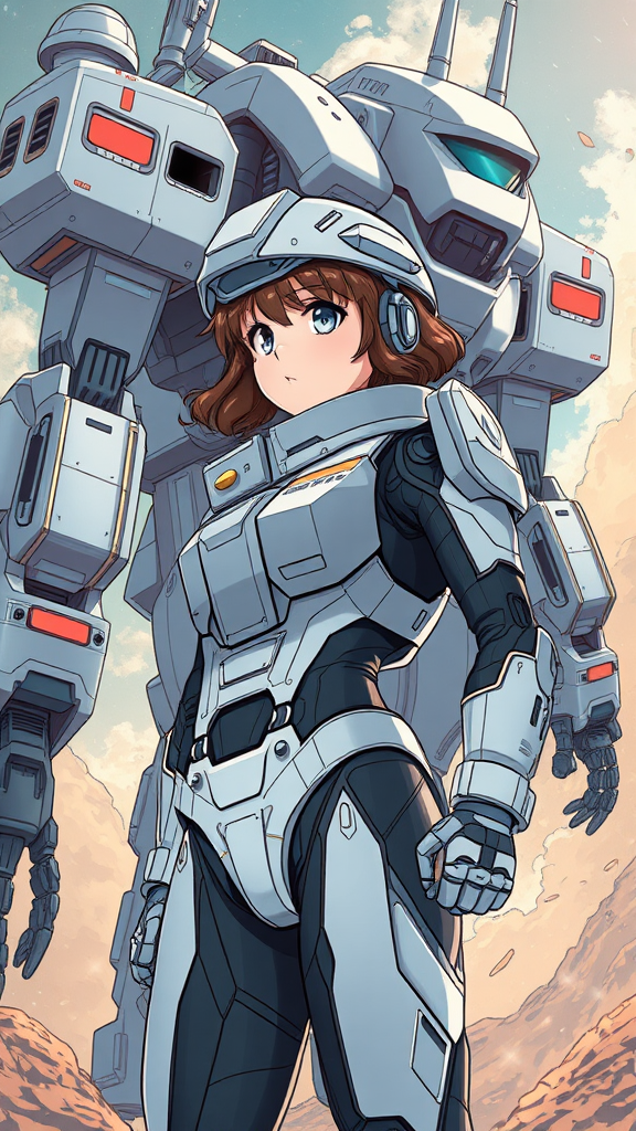 full length portrait of a young armored space explorer girl in a sleek, futuristic suit| dynamic comic book style featuring a towering battlemech| intricately detailed stunning fanart| emotional scene with a tearful android woman| vibrant full color manga aesthetic| anime-inspired dramatic key visual| imagined in the universe of valerian with nartfixer influences| nfixer themes added for depth