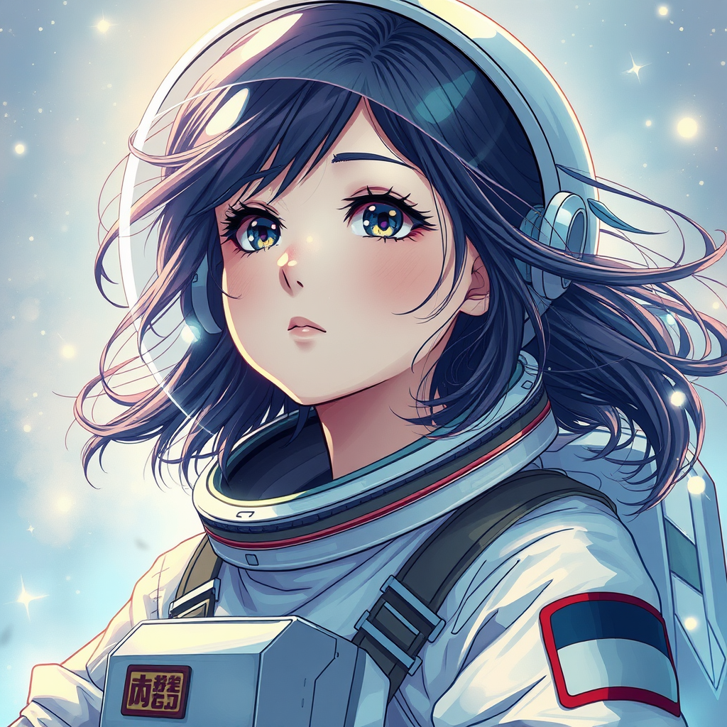 Full length portrait of a young astronaut girl, highly detailed exquisite fanart, breathtaking, with a stunningly beautiful face, ethereal glowing trails surrounding her, subtle light dust particles in the air, vibrant full color in a manga art style, reminiscent of anime key visual, flowing hair gently caught in motion.