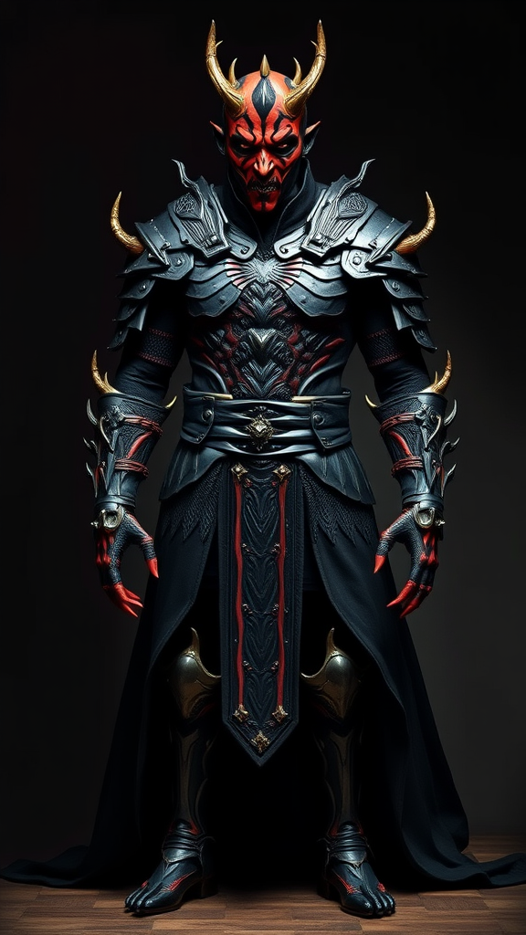 Full length portrait of Darth Maul adorned in a formidable armor crafted from intricate dragon bones interwoven with metal plates, imbuing a gothic fantasy aesthetic reminiscent of a video game character. Despite its sinister elegance, the appearance is marred by unsettling imperfections: the hands and feet appear oddly shaped, and the face is slightly asymmetrical. The figure seems to emerge from the shadows with unexpected mutations including extra limbs and a disfigured form, accentuated by a pair of cross-eyes that contribute to a haunting visage. The overall composition is slightly off-balance, with parts of the body fading into the background, encapsulating a sense of eerie distortion and otherworldly presence.