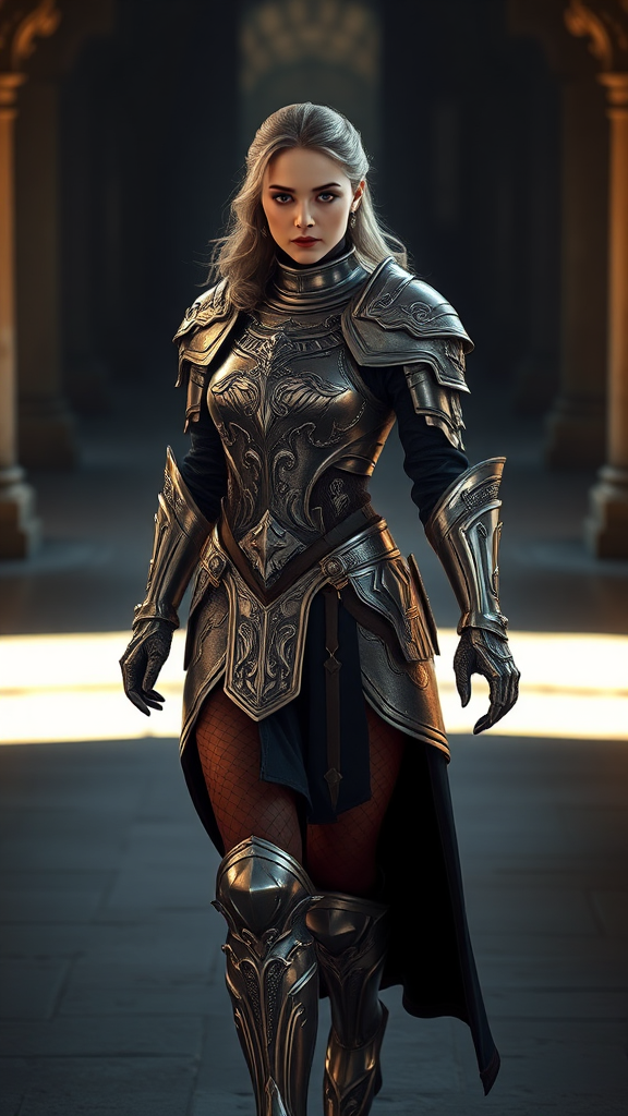 Full-length shot of a female paladin in elegant armor, walking gracefully towards the camera, depicted in slow motion. Her intricate and detailed armor catches the light beautifully, showcasing a masterpiece of design and craftsmanship. She possesses striking features and expressive eyes, with a sharp focus on her realistic silhouette and authentic shadow. Captured with high-quality precision as if photographed by a Canon EOS R6, using a 135mm lens, 1/1250s shutter speed, f/2.8 aperture, and ISO 400. The image embodies the essence of realism and depth, absent of any low-resolution or poor-quality artifacts, and with no elements of 3D, anime, or unrealistic anatomy.