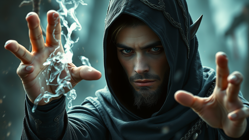 Full male body casting a powerful spell, male elf inspired by Dalamar The Dark from Dragonlance, wearing a black hood, enigmatic elf wizard engaged in magical combat, detailed face and piercing eyes, masterpiece quality, 8k resolution, photorealistic style by Jeremy Mann, Sandra Chevrier, and Maciej Kuciara, sharp focus, realistic with real shadows, 3D appearance. Avoid low resolution, more than 5 fingers, extra arms or hands, facial hair, surplus limbs, horns, light-colored wardrobe, youthful appearance, inappropriate content, and cartoonish or comic styles.