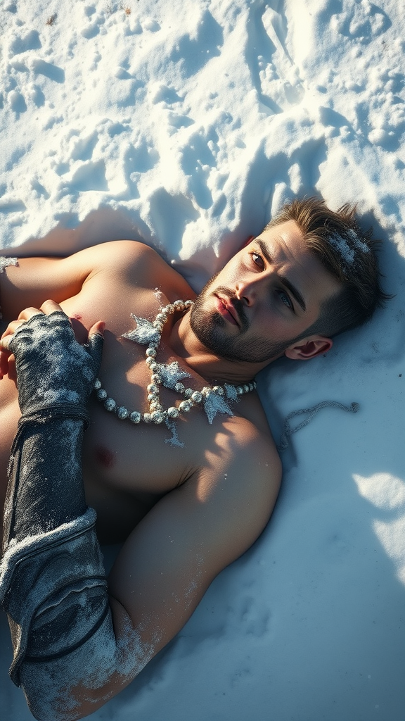 Full male body lying comfortably in the snow, inspired by Sturm from Dragonlance, embodying the essence of a human knight, resting honorably in a serene snowy landscape, detailed face and expressive eyes, a masterpiece of art in best quality, 8k resolution, photorealistic touch, with influences by Jeremy Mann, Sandra Chevrier, and Maciej Kuciara, sharp and realistic features, authentic shadowing, a 3D effect enhancing realism. Model: RPG. Negative aspects: low resolution, anatomical anomalies like more than 5 fingers or 2 arms, presence of a child or elements like white pants, nudity, NSFW content, cartoonish or comic styles, and multiple horses avoided.