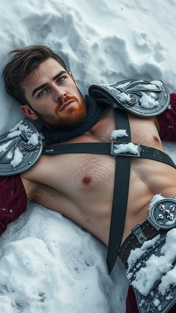 Full male body, lying in the snow, man inspired by Sturm from Dragonlance, noble knight, taking a moment in a wintry landscape, handsome face with expressive eyes, masterpiece quality, 8k resolution, photorealistic, in the style of Jeremy Mann, Sandra Chevrier, and Maciej Kuciara, sharp, hyper-realistic, real shadows, 3D effect, without low resolution elements, maintaining anatomical accuracy, mature, wearing armor suitable for the environment, without inappropriate or fantastical elements.