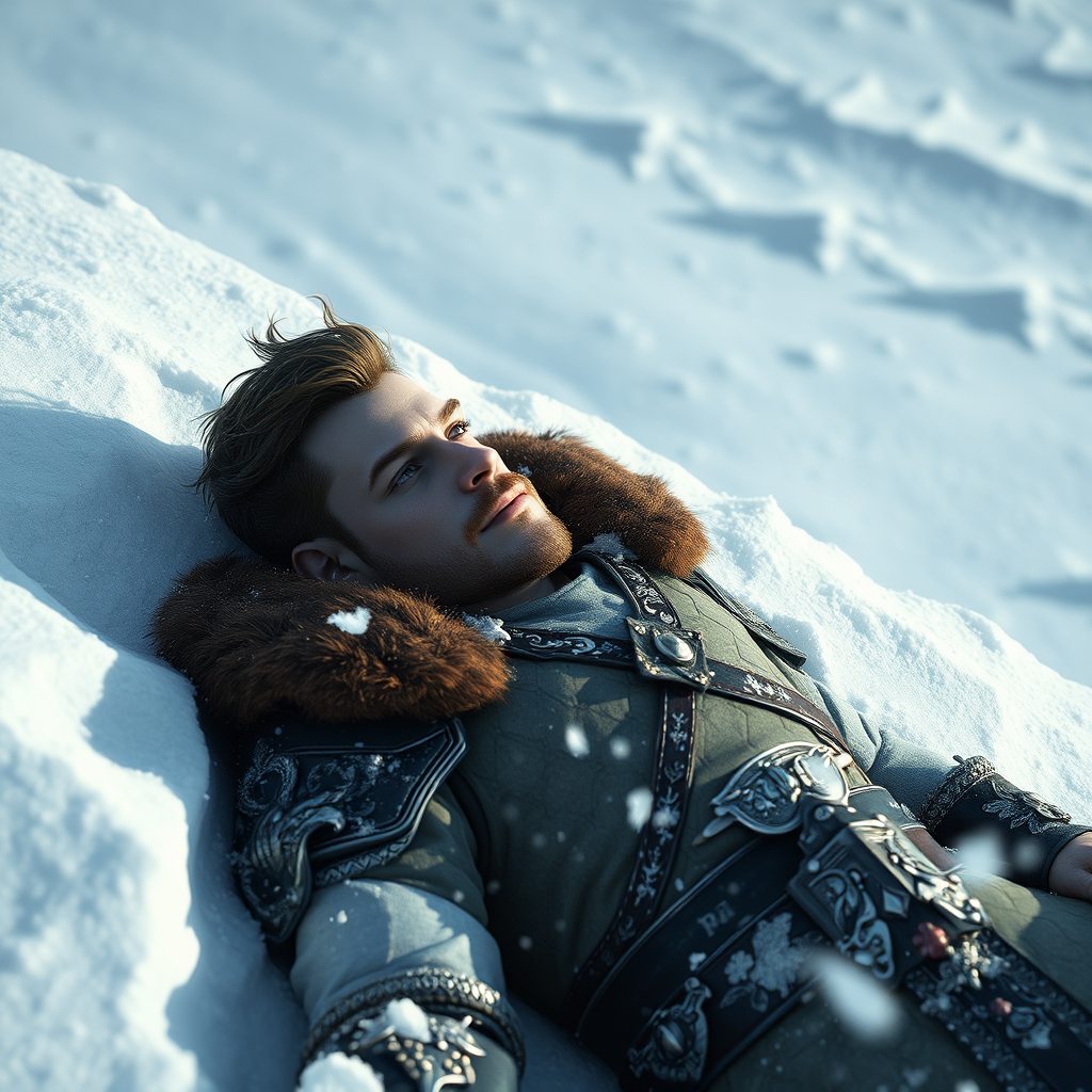 Full male body, reclining in the snow, human male, inspired by Sturm of Dragonlance, noble knight, reflecting amidst a serene snowy landscape, detailed facial features and expressive eyes, masterpiece quality, 8k resolution, photorealistic style, influenced by Jeremy Mann and Sandra Chevrier, with touches by Maciej Kuciara, sharp, realistic portrayal, natural shadowing, rendered in 3D, subtle creative elements while staying true to essence. Model: RPG 4, Negative prompt: low resolution, extra limbs, facial hair, more than two hands, youthful, inappropriate attire, cartoonish style, crowded scene.