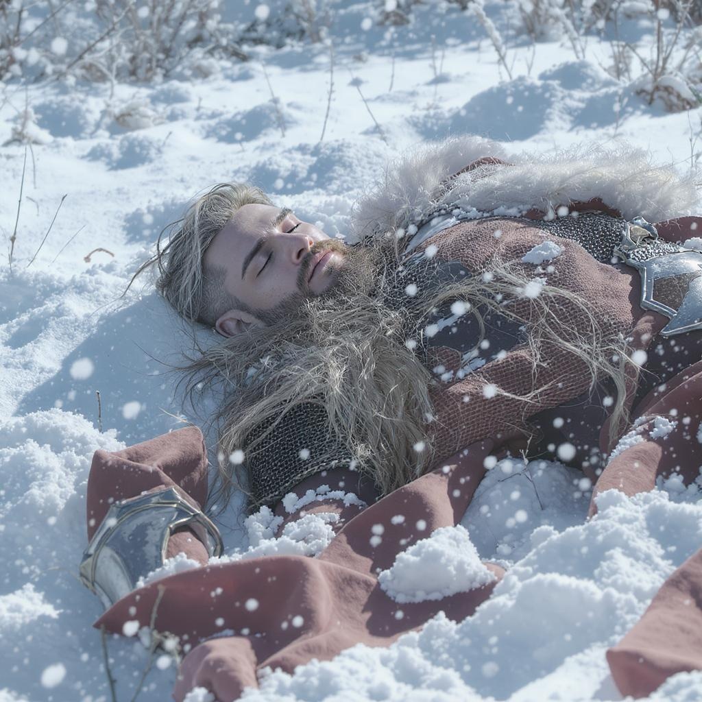 Full male body resting in the snow, human knight inspired by Sturm from Dragonlance, embodying honor and valor, pausing amidst a serene snowy landscape, with a detailed face and expressive eyes, Masterpiece quality, photorealistic 8k resolution, influenced by the styles of Jeremy Mann, Sandra Chevrier, and Maciej Kuciara, showcasing sharp and realistic 3D imagery with authentic shadows, RPG-themed. Negative prompt: low resolution, anatomical abnormalities, facial hair, children, inappropriate content, cartoonish or comic style, excessive elements.
