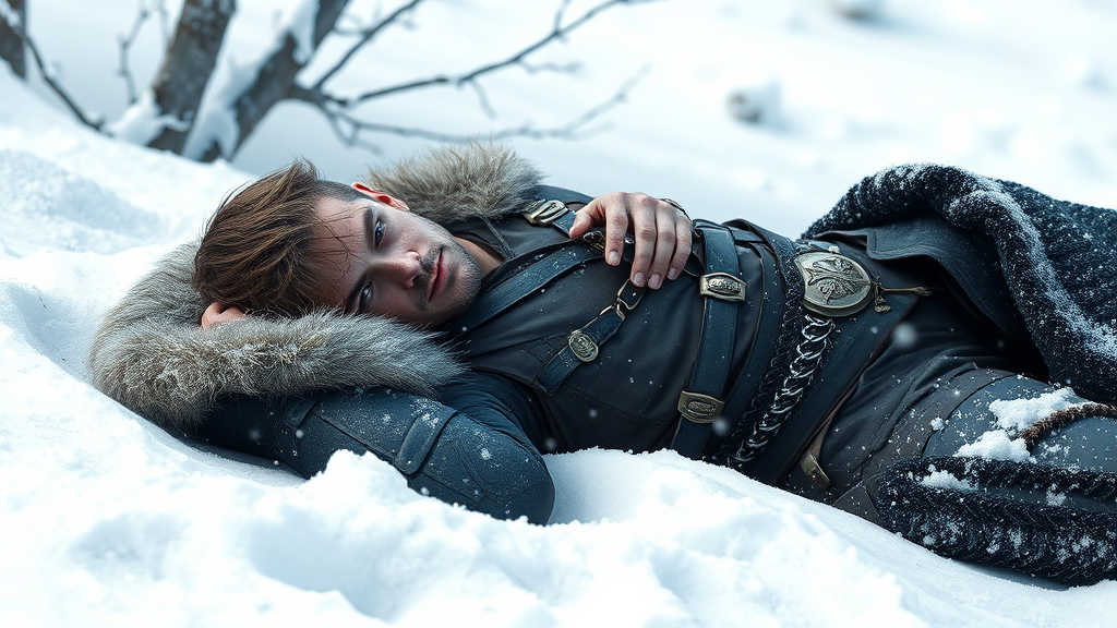 Full male body resting in the snow, male human resembling Sturm from Dragonlance, noble knight, honorable demeanor, pausing in a serene snowy landscape, detailed face and expressive eyes, masterpiece quality, 8k resolution, photorealistic style, inspired by the artistic flair of Jeremy Mann, Sandra Chevrier, and Maciej Kuciara, sharp and realistic depiction with authentic shadows, 3d appearance. Model: RPG, avoid elements like low resolution, extra limbs, facial hair, inappropriate content, or cartoonish features.