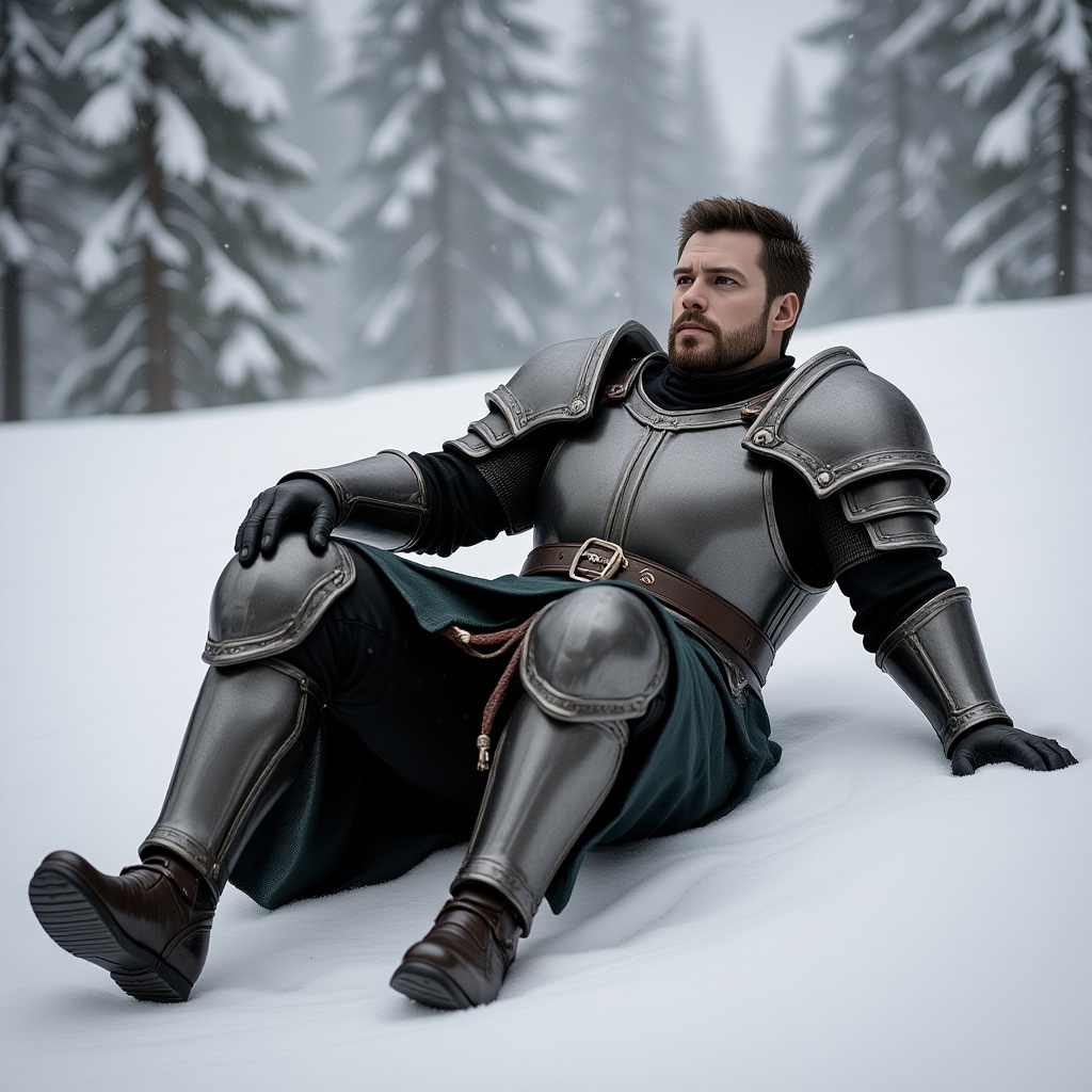 Full male figure resting in the snow, a knight reminiscent of Sturm from Dragonlance, embodying honor and valor, pausing amidst a serene snowy landscape. He is a human knight with a detailed face and expressive eyes. The scene is a masterpiece of the highest quality, 8k photorealistic, crafted with inspiration from artists like Jeremy Mann, Sandra Chevrier, and Maciej Kuciara. The depiction is sharp and realistic, showcasing real shadows and 3D depth. Avoid elements like low resolution, extra limbs or fingers, facial hair, children, inappropriate attire, nudity, and cartoonish or comic styles.