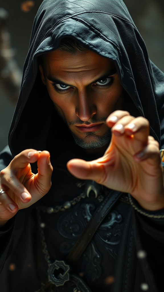 Full male figure, casting an intense spell, enigmatic male elf resembling Dalamar The Dark from Dragonlance, shrouded in a black hood, skilled elf wizard, exuding mystery, deeply engaged in magical combat, detailed facial features and expressive eyes, masterpiece, highest quality, 8k resolution, photorealistic, styled by Jeremy Mann, Sandra Chevrier, and Maciej Kuciara, sharply detailed, realistic with authentic shadowing, 3D realism, avoiding low resolution, maintaining only two arms, clean-shaven, wearing dark, intricate robes, mature, modesty observed.