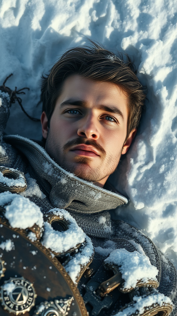 Full male figure lying in the snow, embodying a human knight akin to Sturm from Dragonlance, exuding honor and tranquility amidst a vast snow-covered expanse. His face is detailed, eyes thoughtfully expressive, captured in a masterpiece of art quality, ultra-high resolution, photo-realistic imagery. The work evokes the styles of Jeremy Mann, Sandra Chevrier, and Maciej Kuciara, showcasing sharp and realistic elements with authentic shadows, maintaining a grounded, 3D feel. The scene is devoid of distracting elements such as multiple limbs or fantastical mistakes, ensuring a focus on realism and the solitary knight's serene moment.