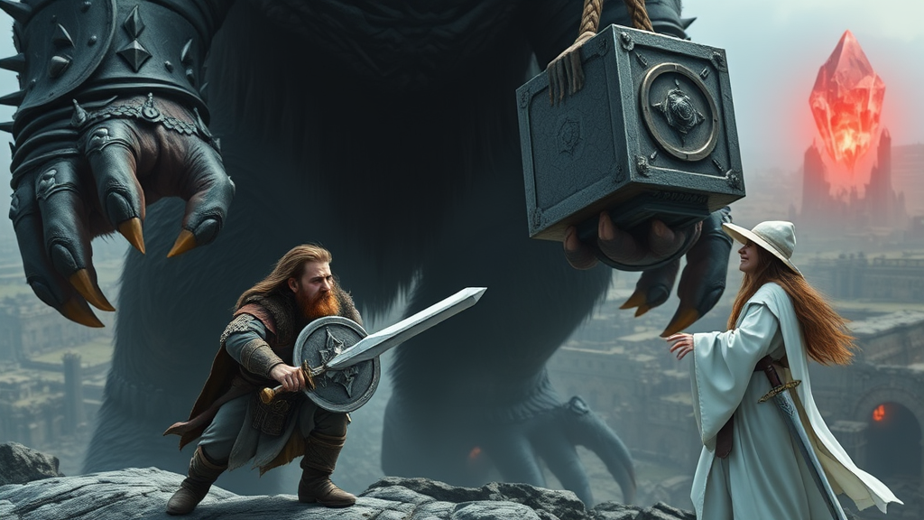 Full male halfling warrior, armed with a short sword and shield, battling a towering behemoth wielding a colossal warhammer, while a cunning female mage in white robes observes from a safe distance, wearing a warm smile and hat, her long hair barely visible under a white cloak, the behemoth's massive shadow looming over the scene, the male halfling's eyes locked in a fierce stare with the behemoth's, his bearded face set in a determined glint, the background showing a sprawling landscape of ancient ruins, with a mysterious glowing red crystal visible in the distance, the female mage's hand casually resting on a sword at her waist, as if ready for an instant draw.