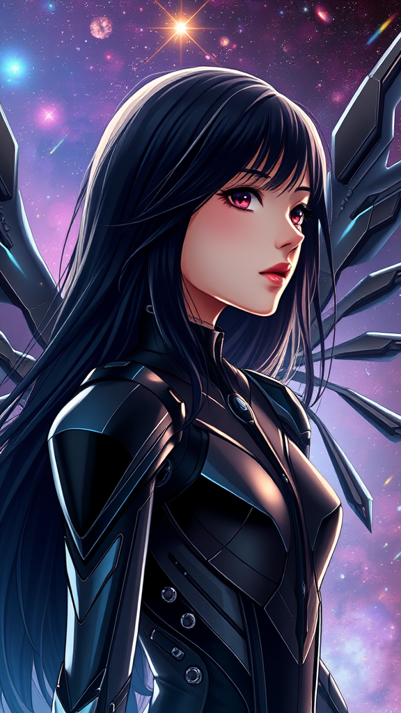 Full portrait close-up of a stunning young woman with long black flowing hair and a slender silhouette, clad in a sleek, futuristic Sci-fi exo-suit. Her face is exquisitely beautiful and carries a dreamy expression as she gazes into the distance. Surrounding her is an intricately detailed glossy black and silver mech with an insectoid design, complete with elaborate Sci-fi wings. Drawing inspiration from Tsutomu Nihei and Akira, the scene unfolds with vibrant quasar light casting dynamic shadows across a dramatic outer space backdrop. The atmosphere is charged with space starlight, swirling galaxies, and streaks of plasma beams. Anime and manga influences are evident in the hyper-realistic 8k UHD render, featuring complex lighting and effects, capturing the essence of an epic cosmic setting.