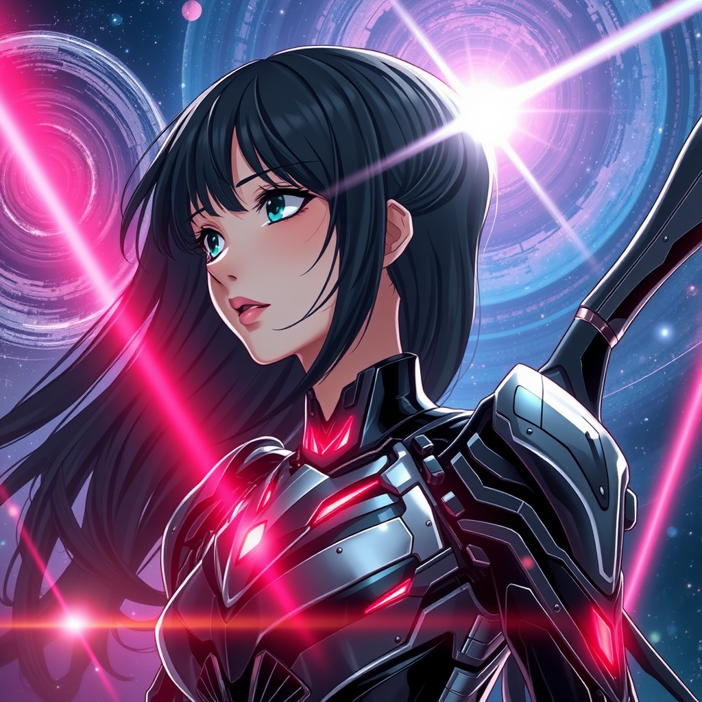 Full portrait close-up of an epic, beautiful girl with a streamlined sci-fi exo costume, featuring a gorgeous dreamy expression, long flowing black hair, and a slender figure gazing into the distance. Her glossy black and silver insectoid sci-fi mech includes intricate details with slender, articulated wings. The design is influenced by the styles of Tsutomu Nihei and Akira, with a vibrant quasar light illuminating her silhouette. Set against a dramatic outer space background with swirling galaxies and space starlight, plasma beams carve through the scene. The composition is rendered in ultra-high definition, embodying elements of anime art and manga drawing with hyper-realistic details and complex lighting effects.