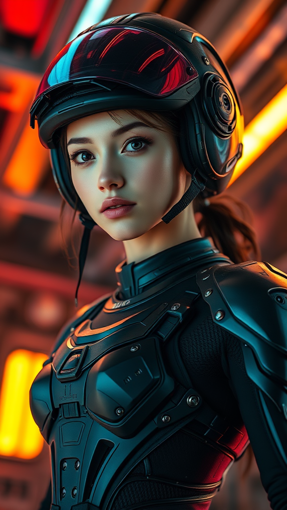 Full portrait close-up three-quarter in focus of a stunning girl with a frowning yet innocent expression, possessing a slender athletic build in a dynamic action pose. She wears a sleek combat exo armor suit equipped with a closed system breathing apparatus and a compact sci-fi helmet, featuring a high-tech glossy transparent visor with cinematic lighting. The setting resembles an intricately detailed interior inspired by the style of "The Expanse," highlighted by neon and volumetric lighting offering an illumination from within. Photographed using a Canon EOS 5D Mark IV DSLR with an aperture of f/8, shutter speed of 1/250 sec, and ISO 100. The image captures depth of field with super detailed elements and natural reflection textures, showcasing cinematic lighting accentuating her hair tail and bare neck. Her dynamic pose, emphasized by narrow hips and an athletic figure, complements the high-tech armor adorned with rivets and symmetry. The scene is free of distortions, maintaining clarity with no presence of artifacts or anomalies, ensuring the focus remains on her expressive face and advanced armor design.
