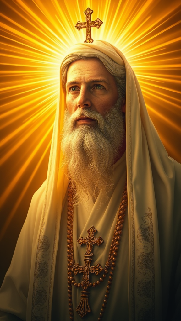 Full portrait of a sacred priest bathed in radiant holy light, captured in ultra quality with stunning visuals and intricate details. The priest exudes a magical ambiance with a divine and beautiful face, set against golden hues. The piece is presented as a 3D masterpiece on a canvas frame, emphasizing perfect anatomy and a serene presence. Despite the ethereal vibes, this portrayal subtly incorporates surreal elements with a splash of unusual colors, creating a dreamlike quality. The artwork focuses on capturing the spiritual essence while avoiding traditional imperfections, ensuring everything aligns harmoniously without extra limbs or disfigurations.