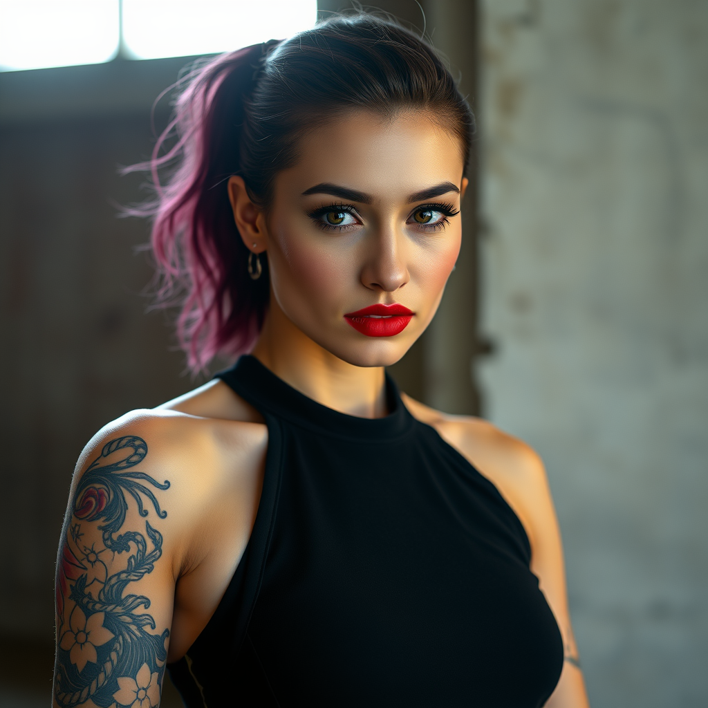 full sleeve tattoo, vibrant red lips, wearing a sleek all-black sleeveless dress, shot with a Canon R5 using a 200mm lens, in sharp focus and captured in RAW format. The image presents a complex, photorealistic, and highly detailed portrait in 8k HD quality, reflecting professional sharpness and color. The photograph embodies ultra high-resolution detail, resembling a highly detailed digital art piece trending on Artstation. With cinematic lighting and a realistic skin texture, it showcases a hyper-realistic, lifelike detail through the lens of a Nikon D850 using Kodak Portra 400. Rich colors and dramatic lighting give the image a strikingly vivid appearance. CGI influences merge with photorealism for a unique portrait, avoiding low quality elements like jpeg artifacts and poorly drawn features, ensuring a high-quality, seamlessly rendered visual experience.