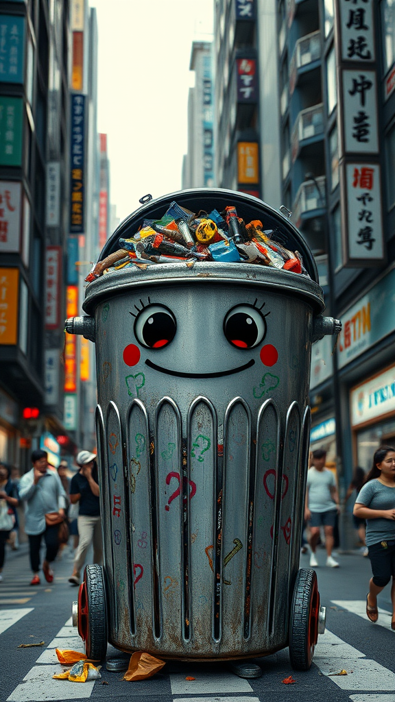 Full view of an anthropomorphic trashcan in the bustling streets of Tokyo, overflowing with various types of colorful, eclectic trash; designed in the distinct style of Yoshii Chie, Hikari Shimoda, and Martine Johanna. The trashcan features expressive, wide eyes and an enigmatic smile, evoking a sense of mysterious charm. Its metallic body is adorned with whimsical patterns and vibrant hues, contrasted against the subtle dark fantasy ambiance of the cityscape. The scene is captured in highly detailed concept art, incorporating elements of inkstyle and sketch work, rendered in digital 2D art to enhance its surreal and captivating presence. Elements of the surrounding city appear slightly blurred to emphasize the trashcan's striking details, seamlessly blending fantasy with reality in this imaginative portrayal.