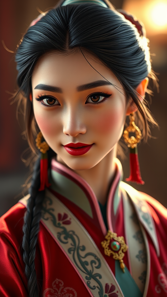 Fullbody portrait of a character inspired by Mulan from Disney, rendered with exquisite detail, captured in a 30-megapixel, 4k resolution using an 85mm lens, sharp focus, with settings f:8, ISO 100, and shutter speed of 1/125. The scene is brought to life with diffuse backlighting, creating a soft yet dramatic effect, reminiscent of an award-winning photograph. The portrait includes a small catchlight in the eyes ensuring high sharpness and stunning facial symmetry, captured in 8k resolution for exceptional clarity.